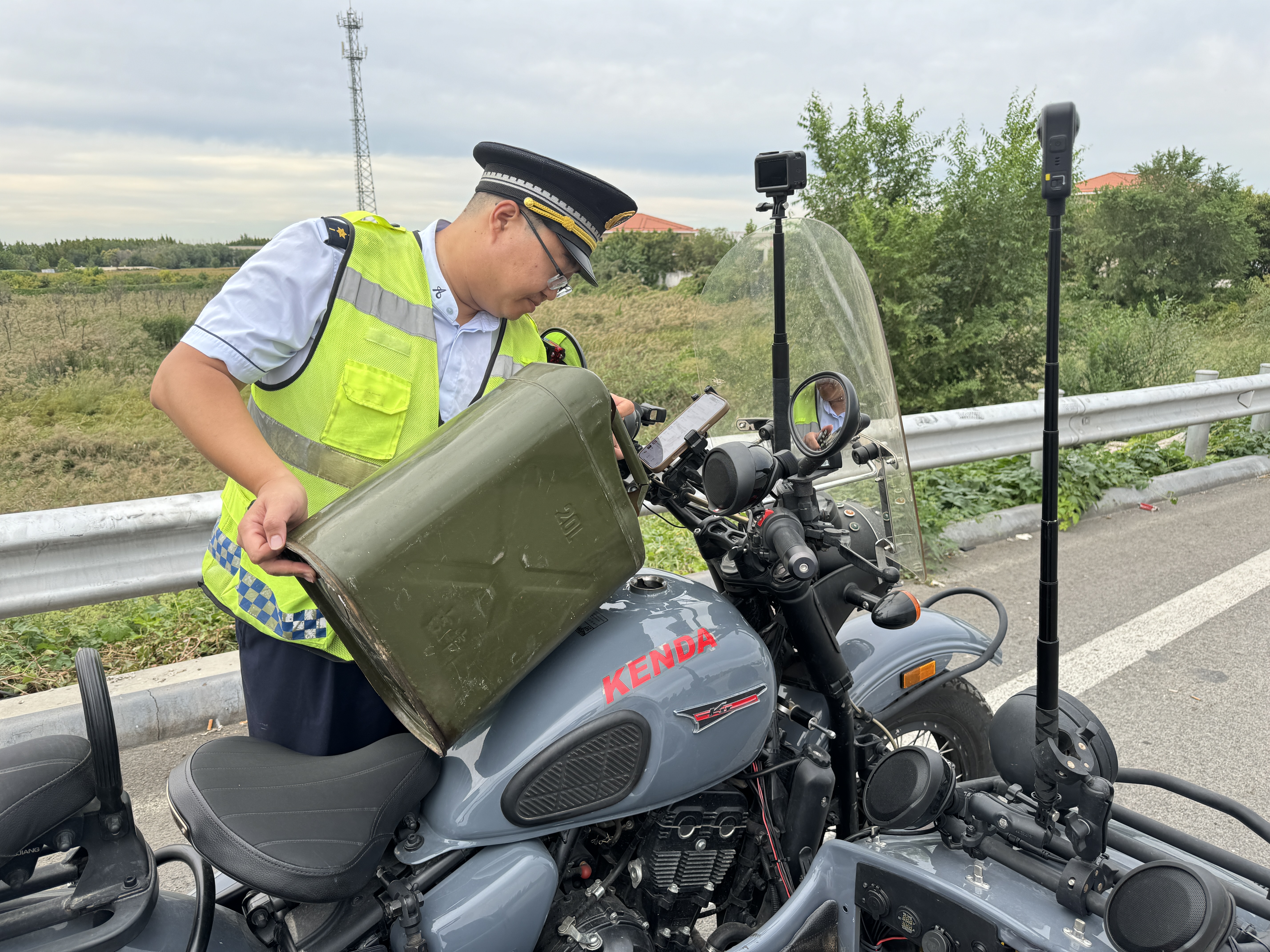经询问,该摩托车因燃油耗尽导致无法启动,驾驶员焦急万分。了解情况后,收费班长第一时间上报值班站长,并迅速启动应急救助机制。工作人员将车辆推至安全区域,随后驾驶站内应急车辆,携带符合安全规范的加油设备,顺利为摩托车加注汽油。但车辆并未成功启动,驾驶员发现车辆出现亏电情况,于是班长又帮助进行推车、搭电,最终车辆重新启动。驾驶员连声道谢:“太感谢你们了!没有你们帮忙,我真不知道该怎么办,你们的服务太周到了!”