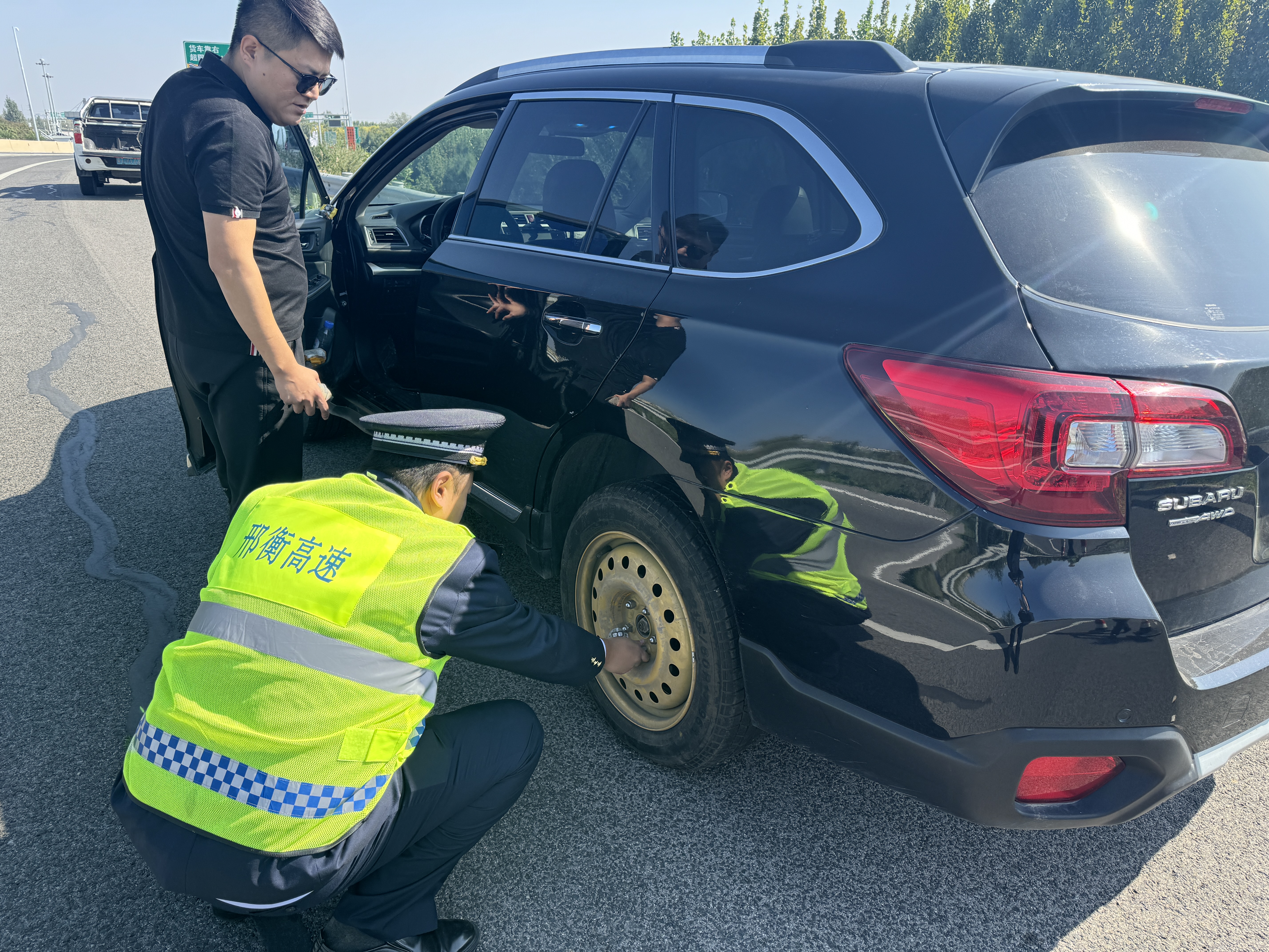 当日11时许,一辆小客车准备从衡水北收费站驶入高速,车辆行至入口匝道时,突然发生爆胎,车身瞬间倾斜。情急之下,司机只能将车停靠在应急车道,尝试更换备胎却因工具使用不熟练屡屡受挫。而一旁驾驶公车路过的站区工作人员发现这一情况后,立即携带工具赶到现场。为保障安全,工作人员先在车辆后方设置安全警示标志,引导过往车辆减速避让。随后俯身拆卸轮胎螺丝,帮忙更换轮胎,动作娴熟且有条不紊。经过近20多分钟的忙碌,成功为车辆换上备胎,确保车辆能够正常行驶。