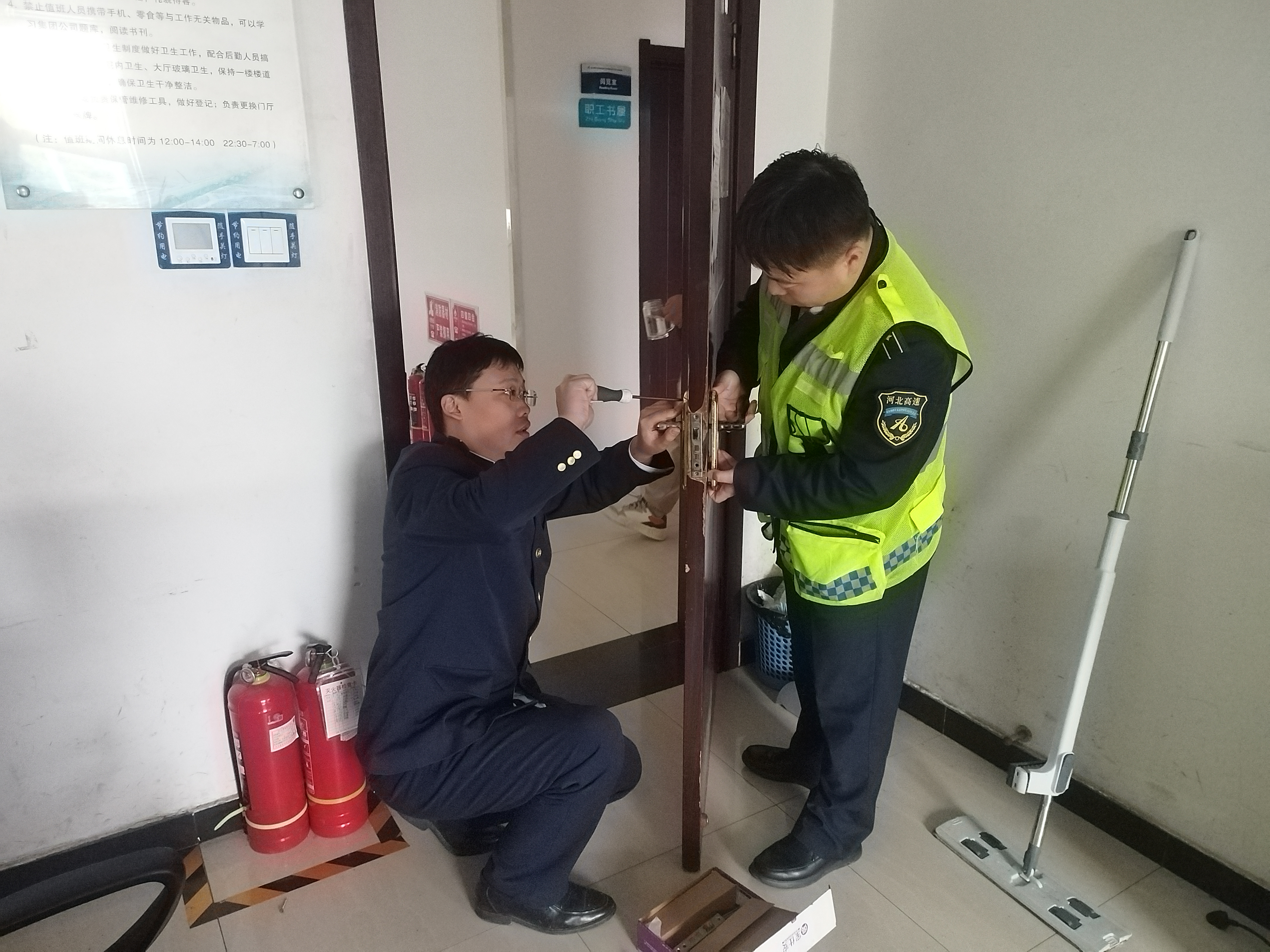 当日上午,值班室门锁出现故障,无法正常使用。值班人员发现后,立即上报值班站长和安全员。经检查,原因为门锁长期高频使用导致螺丝松动、卡扣脱位,造成无法开启。值班站长随即组织后勤人员,使用改锥、扳手等工具对门锁进行拆卸与维修。经过一番努力,门锁功能恢复正常。