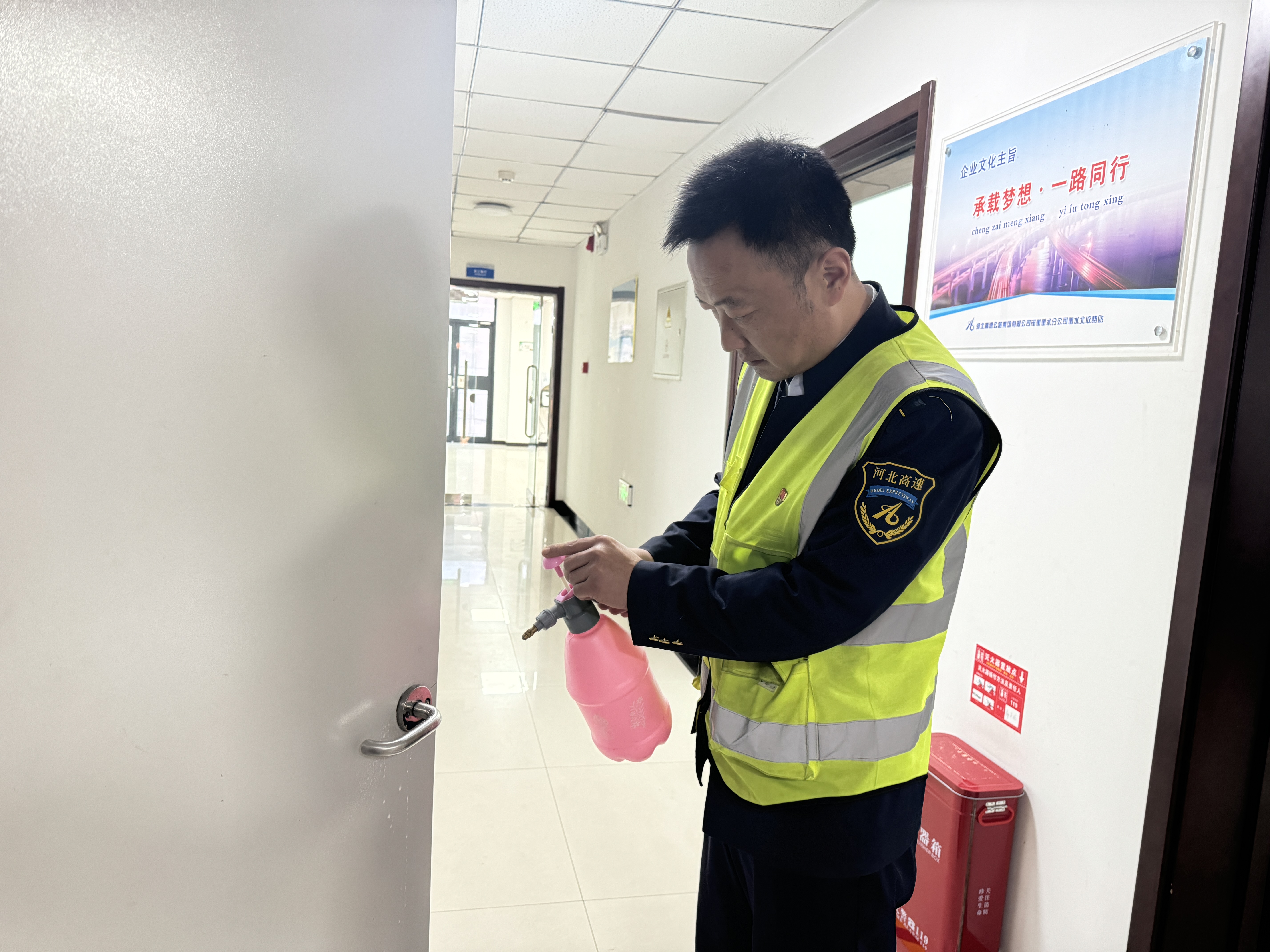 二是优化环境消杀,净化通行空间。建立常态化、全覆盖消杀机制,对收费岗亭、办公区域、食堂餐厅等重点场所定期开展全面消杀,针对收费窗口、门把手、公共座椅等高频接触部位强化清洁频次。每日定时开窗通风,保持室内空气流通,从源头减少病毒滋生环境;食堂定期开展卫生专项检查,严格规范食材处理、餐具消毒等流程,全力防范食源性感染风险。