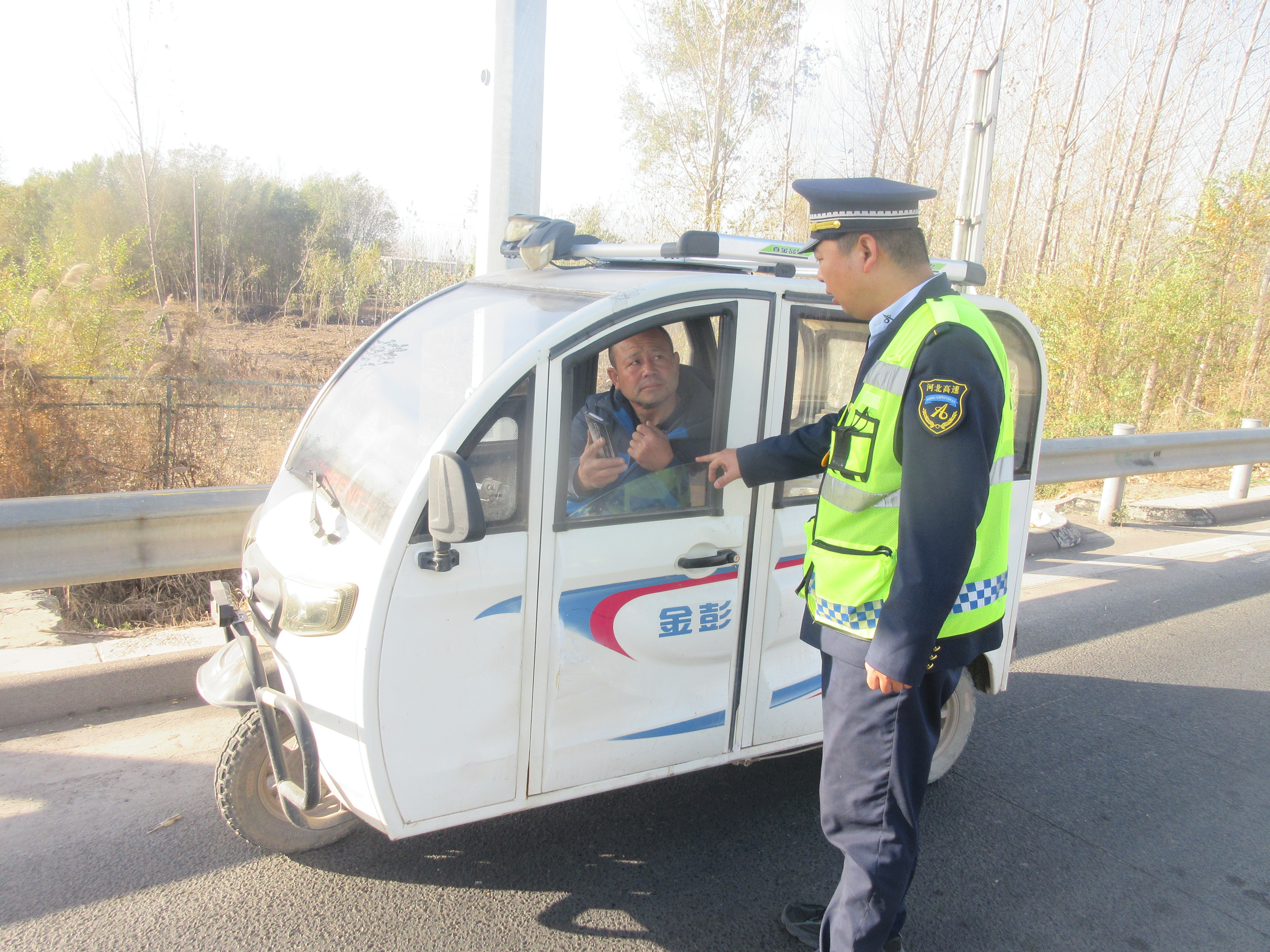 11月20日,冀州南收费站及时劝返一辆欲驶入高速公路的电动三轮车,消除了道路安全隐患。在严格执行行人及非机动车禁止通行高速公路规定的同时,积极为司乘人员提供延伸服务。