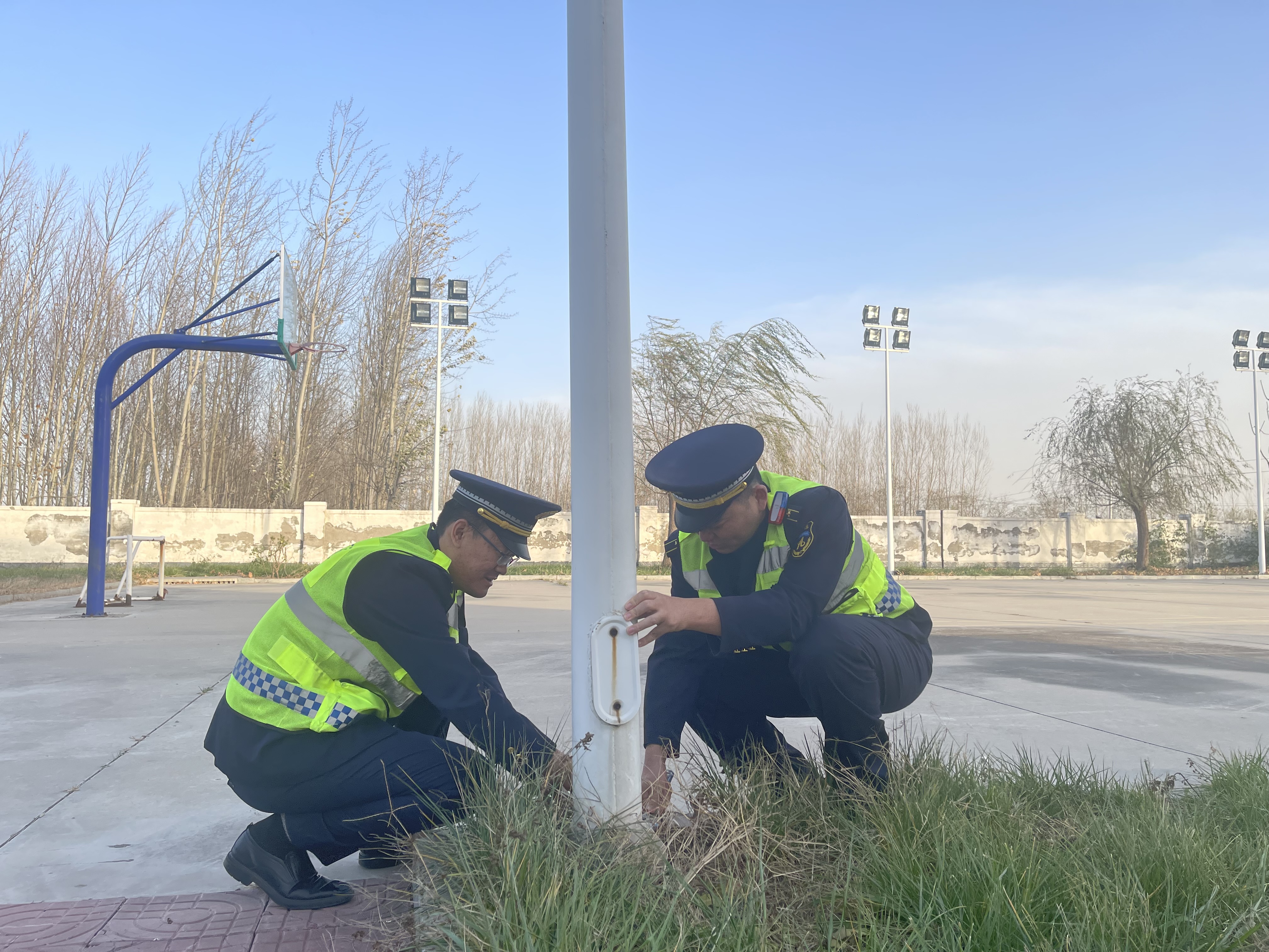 二是检查庭院及宿办楼区域设施。对庭院旗杆、高杆灯、电动大门和宣传牌等设施稳固性进行检查,确保底座牢固,无松动。同时对宿办楼门窗玻璃的完好性、消防器材的有效性、用电线路的安全性进行了排查,确保所有设施和设备在冬季大风天气下均能正常运行。