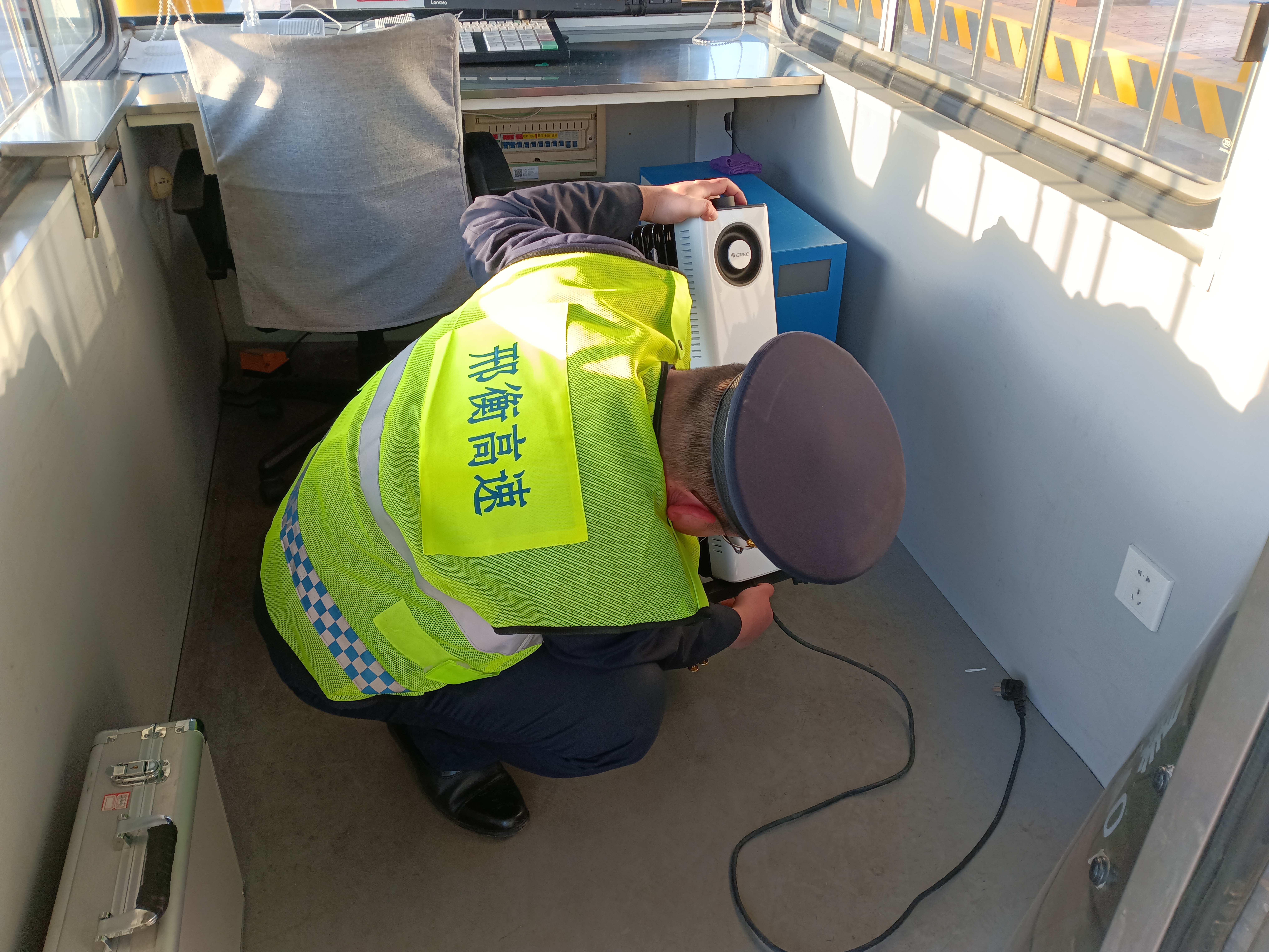 工作人员对收费岗亭逐一进行检查。检查电暖气时,细致查看电源线是否破损、接头有无发热现象,同时确认设备周边无衣物等易燃物品,散热口未被杂物堵塞;排查空调时,重点核查线路负载能力、漏电保护装置运行状况,同步清理滤网以避免设备过热故障。
