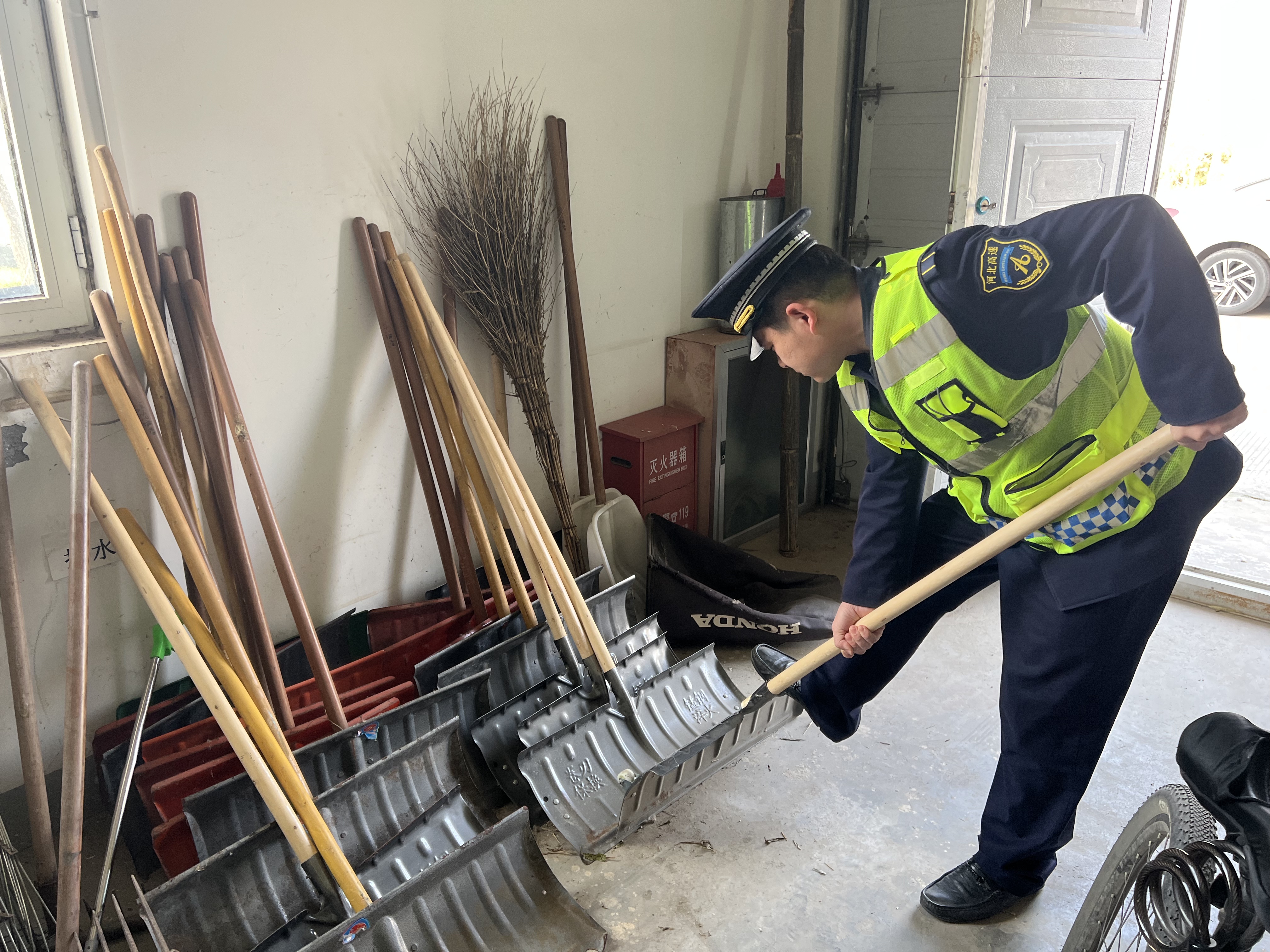二是检查物资,清点除雪铲、铁锹、扫把、融雪剂、手套、反光锥等除雪工具,打有准备之仗。