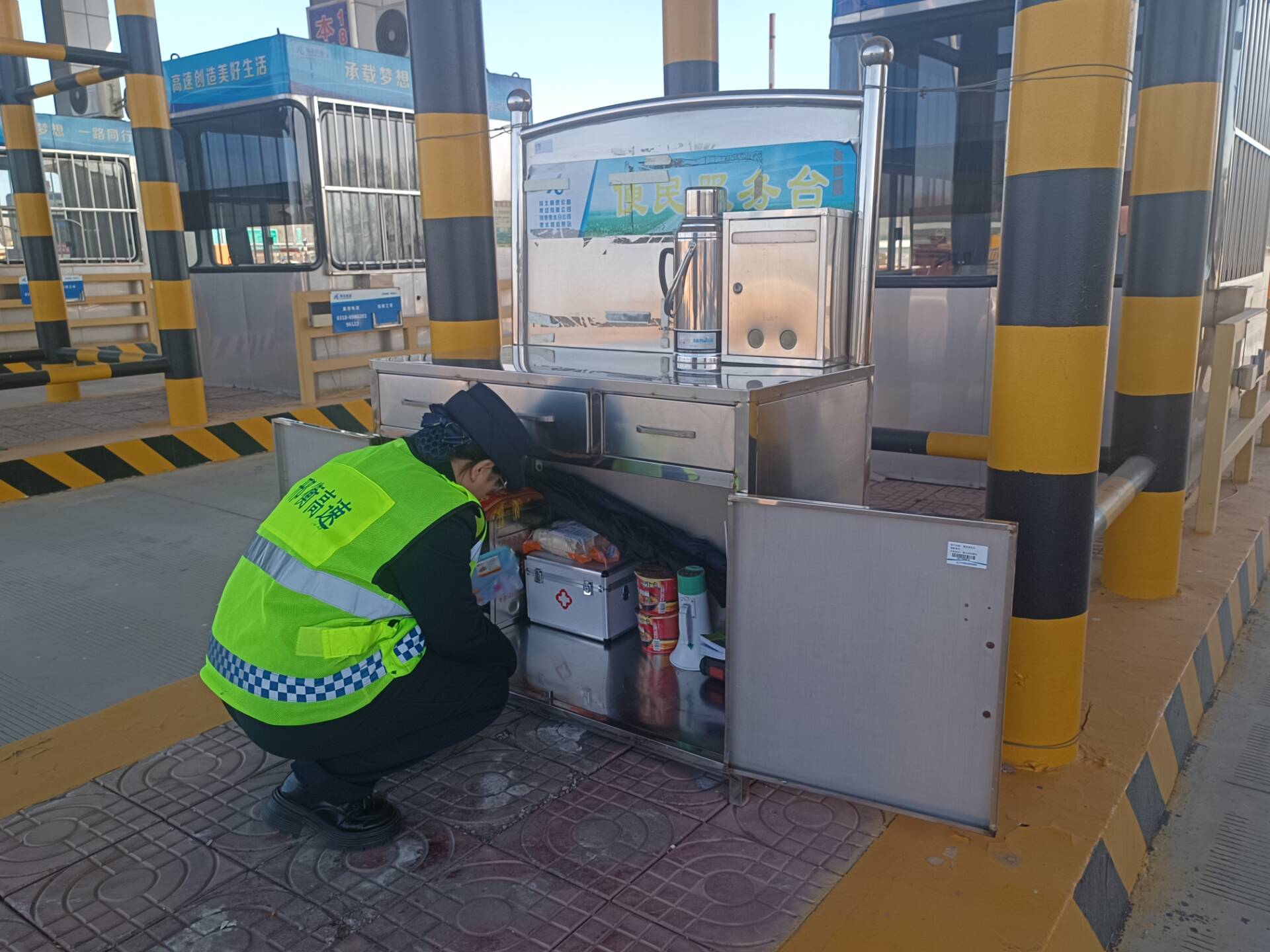 四是充分利用便民服务台,主动为滞留司乘提供热水、充电器、简易修车工具、路线指引等暖心服务,切实帮助司乘解决实际困难,并提醒过往车辆当心路面结冰,减速慢行,注意行车安全,确保在低温天气下,司乘人员能够感受到贴心的服务和关怀。