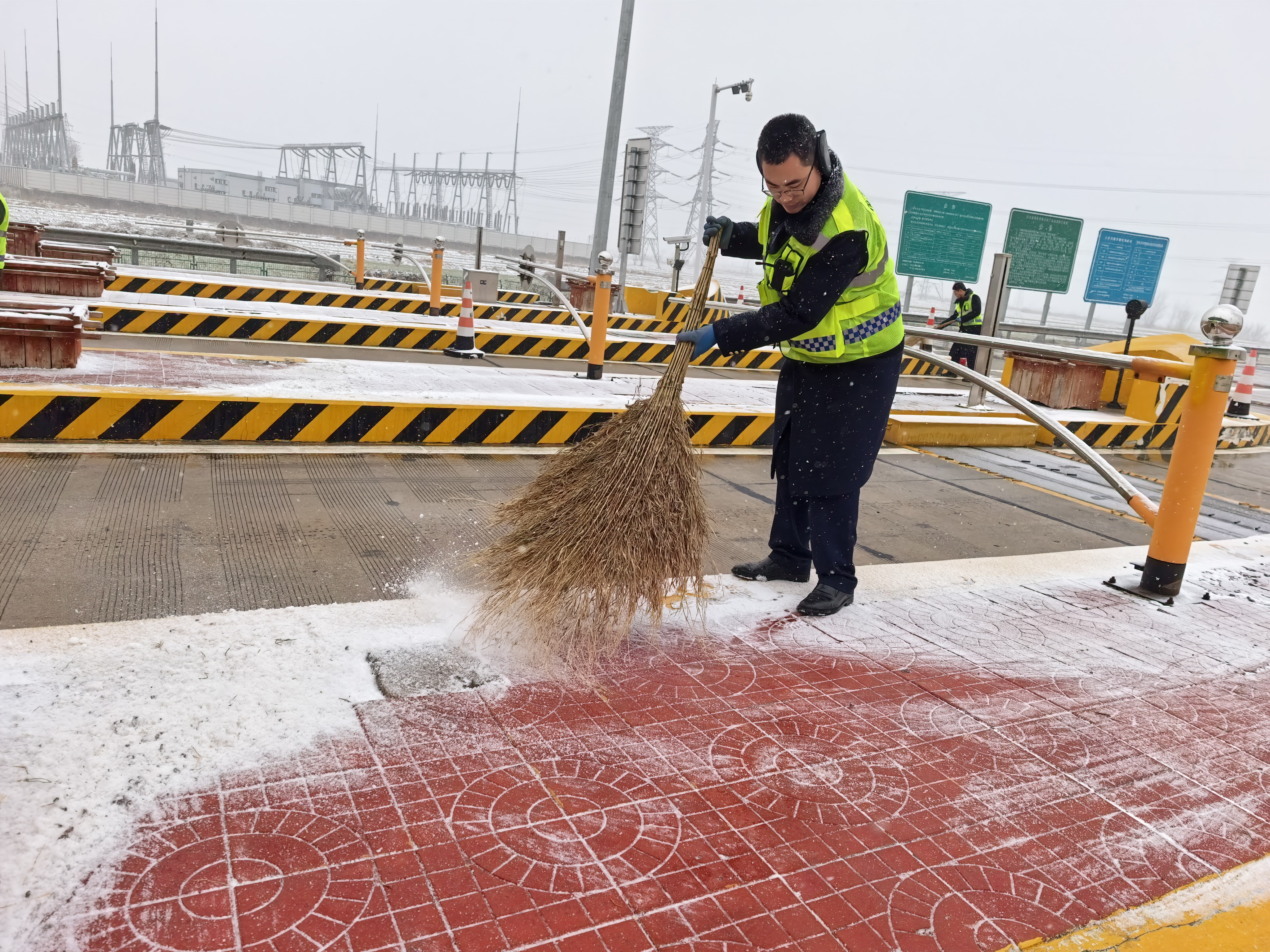 风雪无阻坚守,全员上阵保畅通。降雪伊始,收费站全体人员迅速投入除雪保通战斗。针对车道容易积雪积冰问题,明确应急处置责任分工,对收费亭周边、车道出入口等易积雪结冰区域进行循环清理,确保车道无积雪、无结冰,充分贯彻“雪停即清、有雪即除”的工作要求,确保车道畅通无阻。此外,收费站安排专人在广场值守,引导过往车辆减速慢行,提醒司乘人员谨慎驾驶,全力保障雪天道路通行安全,切实筑牢冬季道路交通安全防线。同时为滞留司机提供热水、方便面及车辆应急维修工具,用贴心服务化解低温严寒带来的不便。