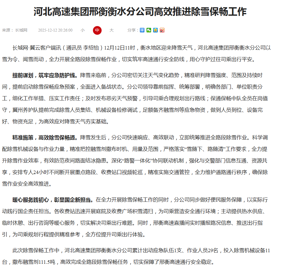 河北高速集团邢衡衡水分公司高效推进除雪保畅工作