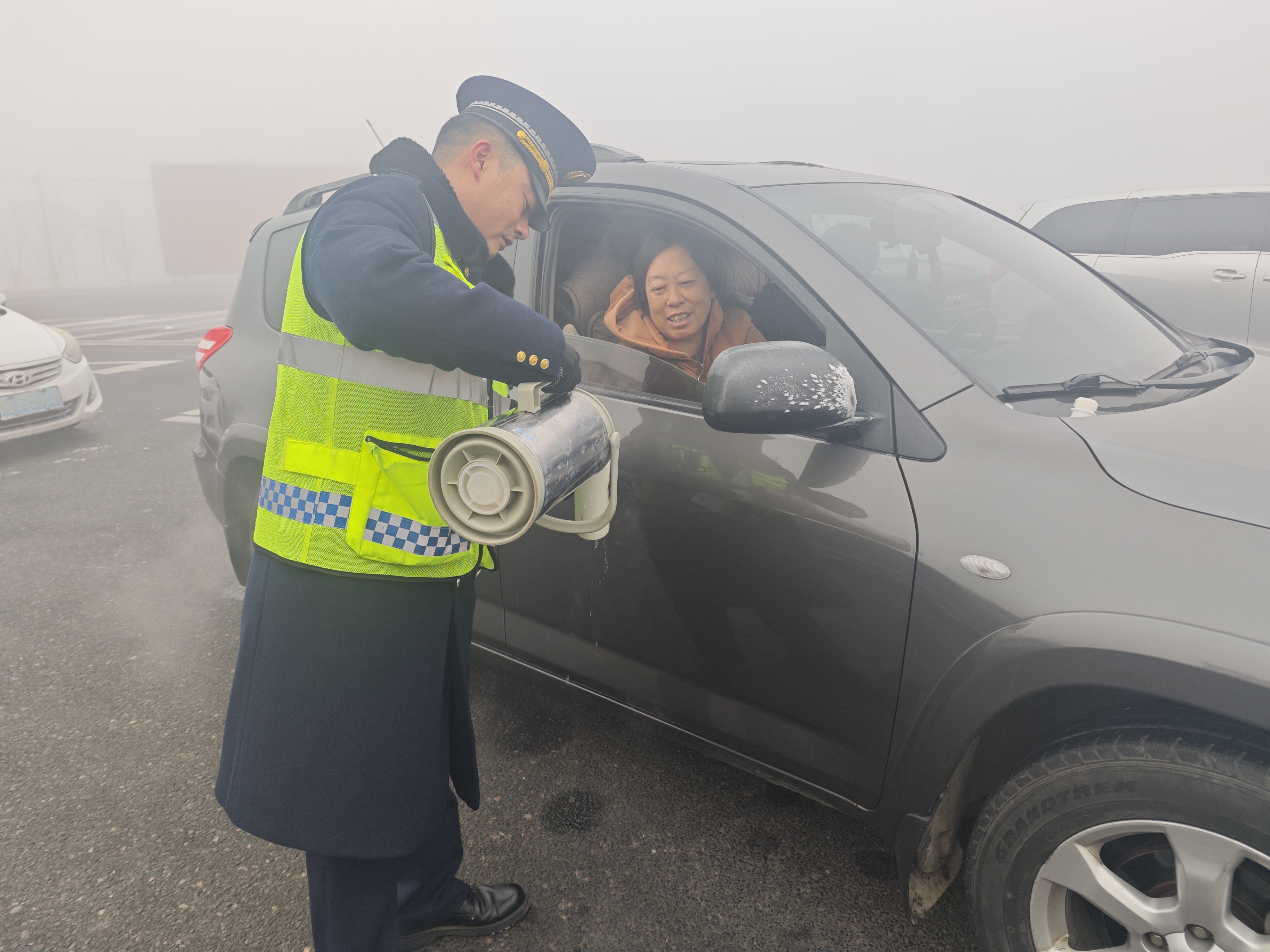 面对突发天气与司乘人员的实际困难,冀州西收费站迅速行动,在严格执行封道措施的同时,积极开展延伸服务,全力做好现场保障与人文关怀。一方面,收费站工作人员主动为滞留人员送上一杯杯暖心的热水和泡面等简餐,缓解他们焦急等待的情绪,用细致服务传递河北高速的温度。另一方面,现场疏导人员加强广场秩序维护与车辆疏导,耐心劝说不急于出行的车辆驶离,减轻广场压力,确保安全区域。对于确有出行需求的司乘,工作人员则贴心提供周边可行的导航路线建议,并反复叮嘱其务必开启雾灯、保持车距、减速慢行,将“安全第一”的提醒落到实处。