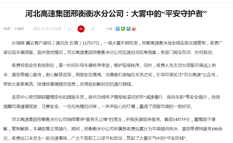 河北高速集团邢衡衡水分公司:大雾中的“平安守护者”