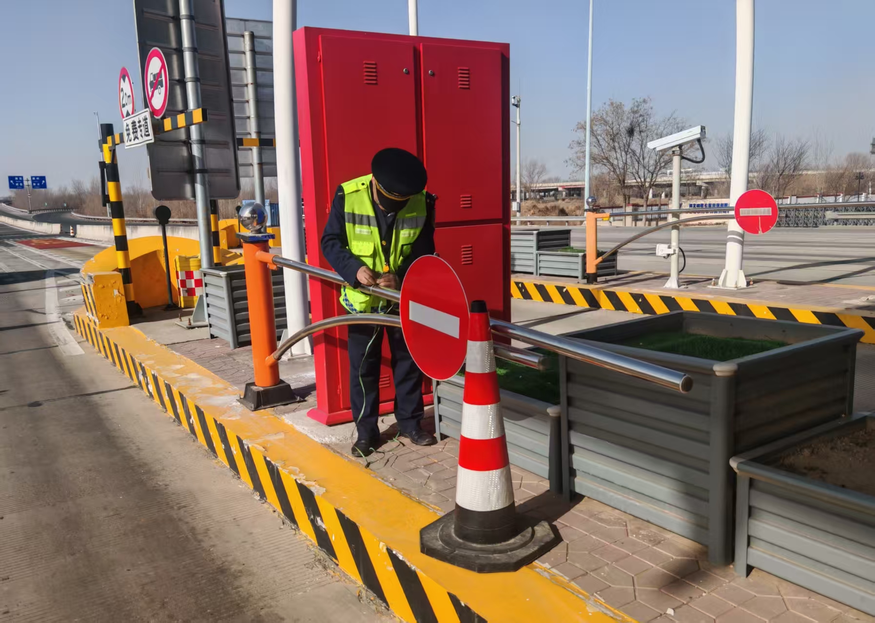 收费班长首先对收费广场的雨棚、标识牌、限高设施、车道栏杆等设施进行全方位检查,仔细核查是否存在松动、损坏等情况,并及时做好加固,防止因大风导致设施损坏或脱落,危及过往车辆与人员安全,确保各类设施在大风天气下正常运行。