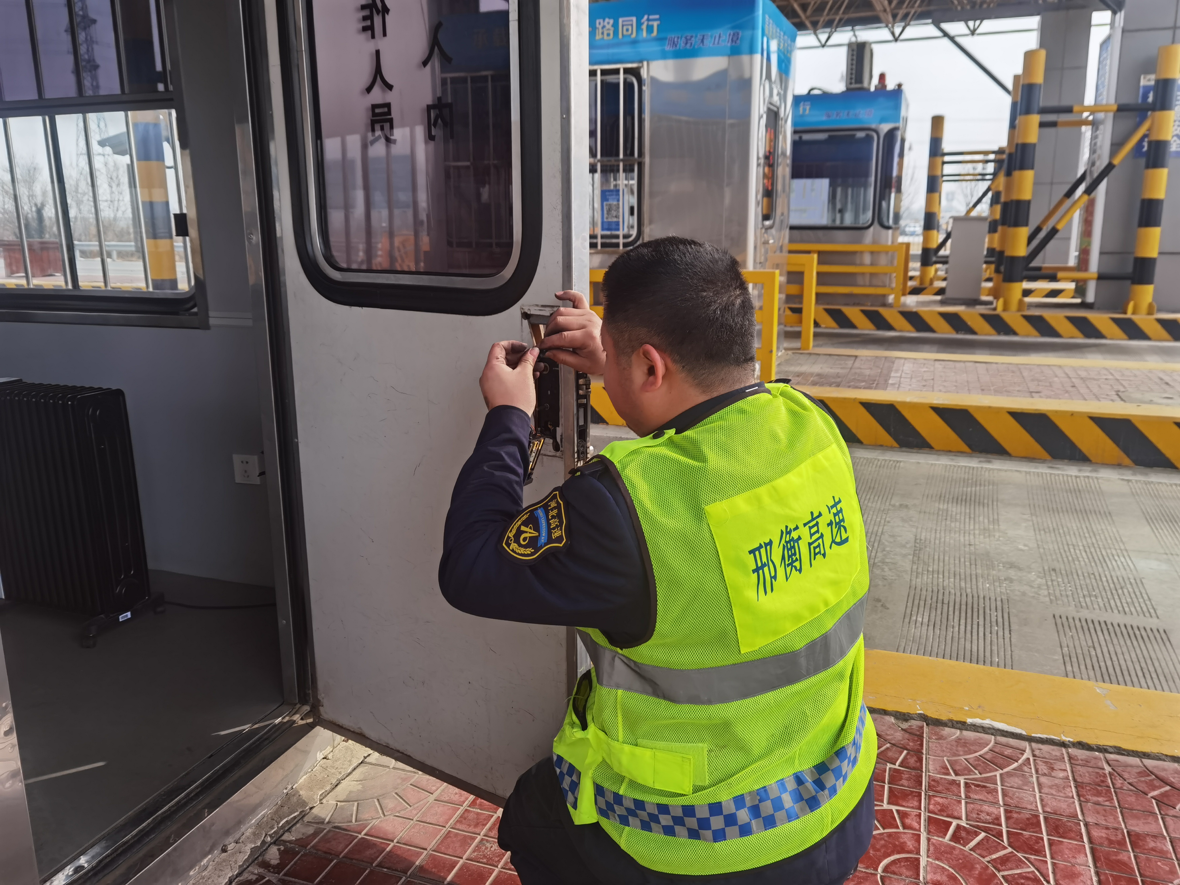 2月4日,冀州西收费站收费员夜班值守时,发现站内103岗亭门锁出现故障,里外开启均不灵活,严重影响后续工作开展与通行保障。收费班长第一时间报备,后勤人员迅速到场排查,确认故障原因是门锁锁舌断裂,无法正常伸缩实现锁定功能。