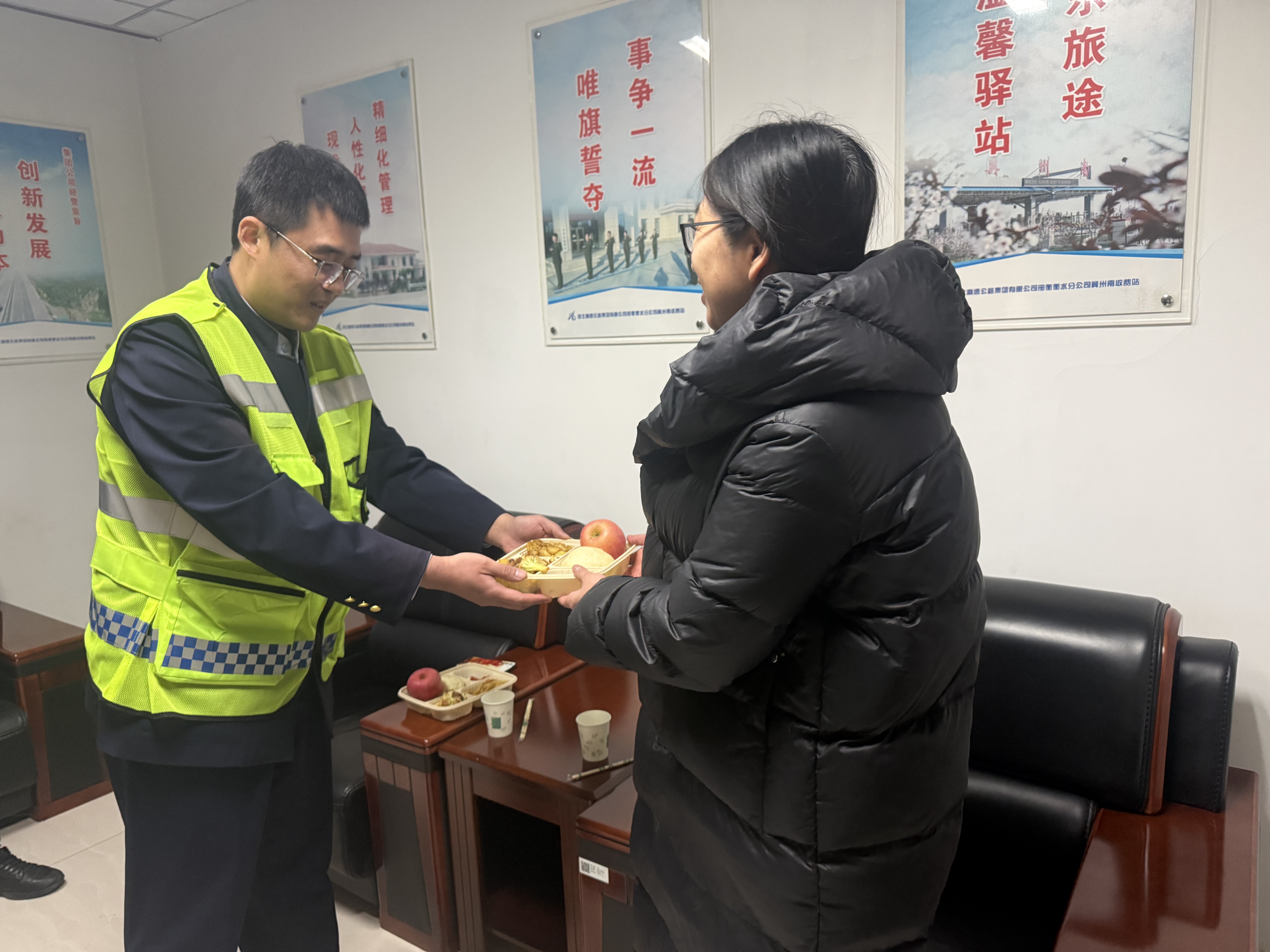 考虑到司乘一路奔波、尚未就餐,收费站工作人员特意从职工食堂备好热菜热饭,细心打包送至司乘手中:“正好赶上食堂开饭,您趁热吃,不够还有!”贴心的服务并未止步于此,工作人员还提供了热水与纸巾,让故障车主体会到寒冬春运路上的浓浓暖意。