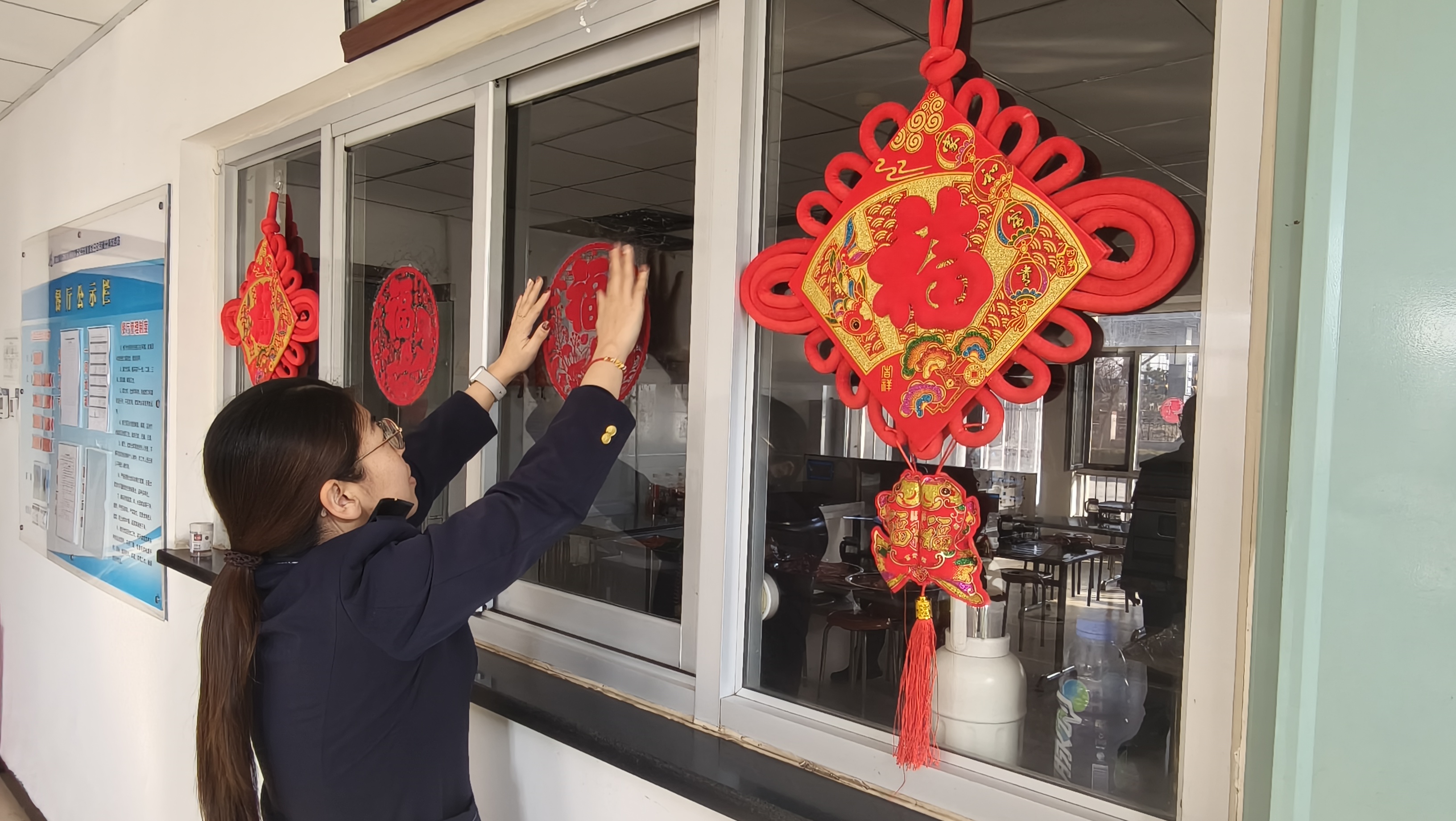 活动现场,职工们热情高涨,分工协作。一串串红彤彤的灯笼高高挂起,一张张寓意吉祥的“福”字和春联张贴在门窗立柱之上,一个个精美的中国结随风轻摆,处处洋溢着欢乐祥和的节日气息。这些装饰不仅美化了收费站的环境,更传递着收费站对全体职工以及过往司乘人员真挚的新年祝福。