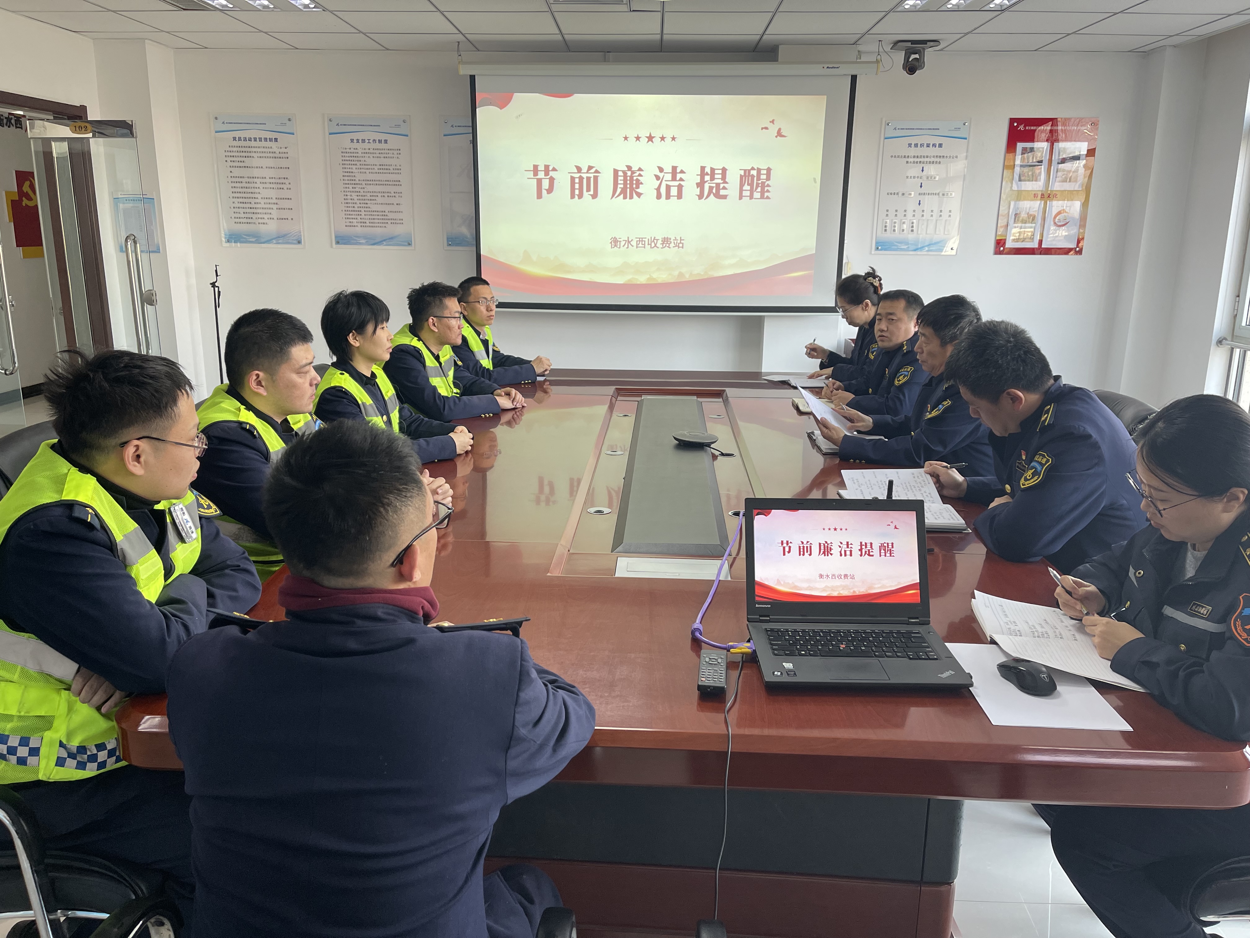 2月12日,为切实筑牢节日期间廉洁防线,严防“四风”问题反弹回潮,营造风清气正的通行环境与工作氛围,衡水西收费站以“护航平安春运 践诺清廉春节”为主题,开展节前廉洁提醒工作,为全体干部职工敲响廉洁警钟,以铁的纪律保障节日期间道路安全畅通。