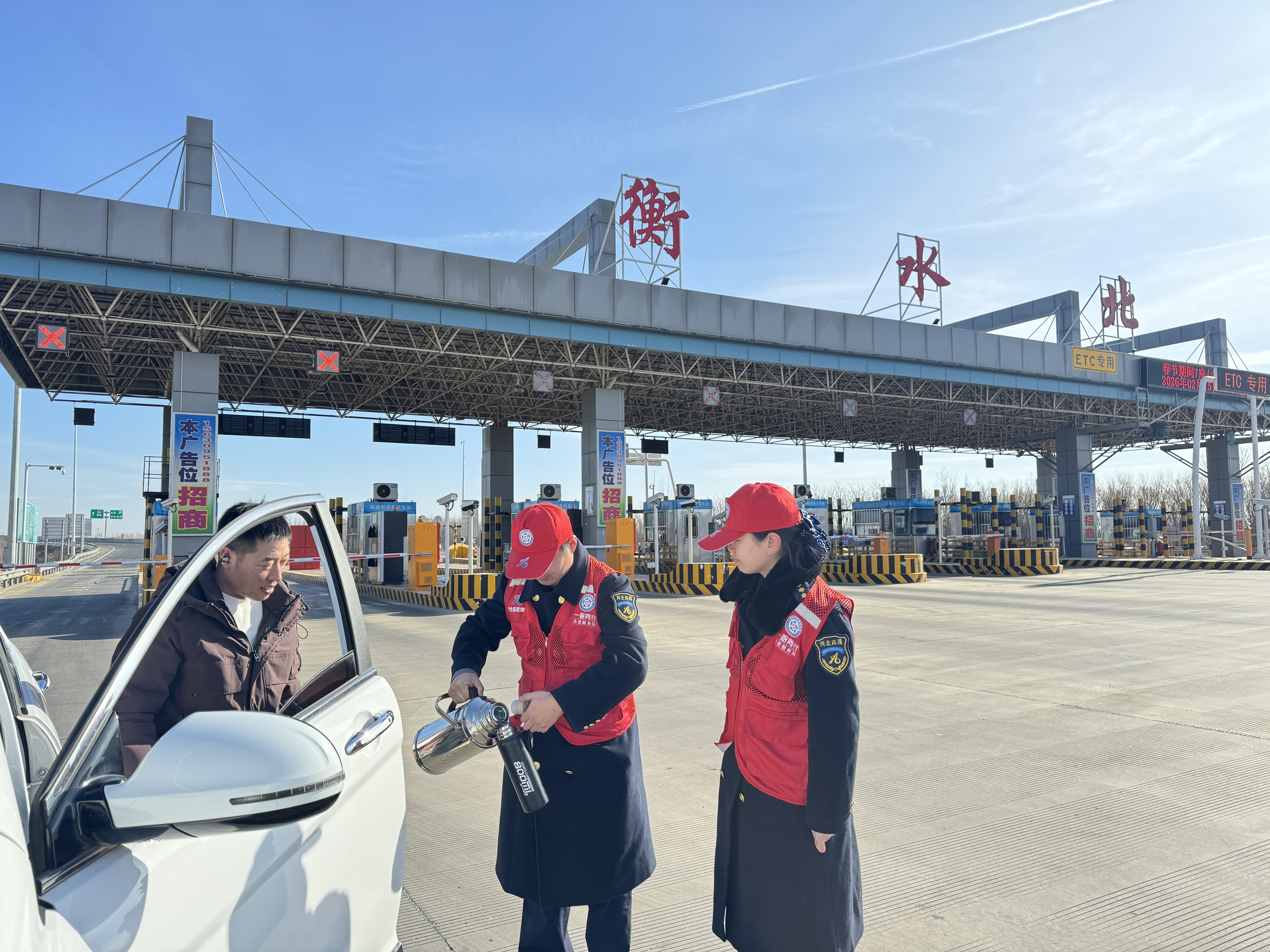 除夕万家团圆时,“一路同行”志愿者们坚守岗位、默默奉献,向过往司乘赠送福字、春联,送上热水补给与通行指引,在坚守中传递新春暖意,以暖心服务护航司乘平安返乡。春节假期出行热度持续攀升,各收费站同步发力、暖心护航:衡水西收费站深化路警联勤联动机制,联合高速交警精准研判车流、设置联合执勤点,织密道路安全防护网;冀州西收费站主动为胎压异常车辆检查充气,及时消除行车隐患,护航司乘安心前行;冀州南收费站耐心细致为走亲访友群众精准指路,温馨提醒安全驾驶,用真诚服务温暖旅途;衡水北收费站快速协助故障车辆更换备胎,及时解决司乘燃眉之急,以高效行动彰显责任担当……一次次及时援手,一句句温馨叮嘱,一幕幕坚守身影,汇聚成春节保畅路上最动人的风景,让司乘真切感受到河北高速带来的温暖与关怀。