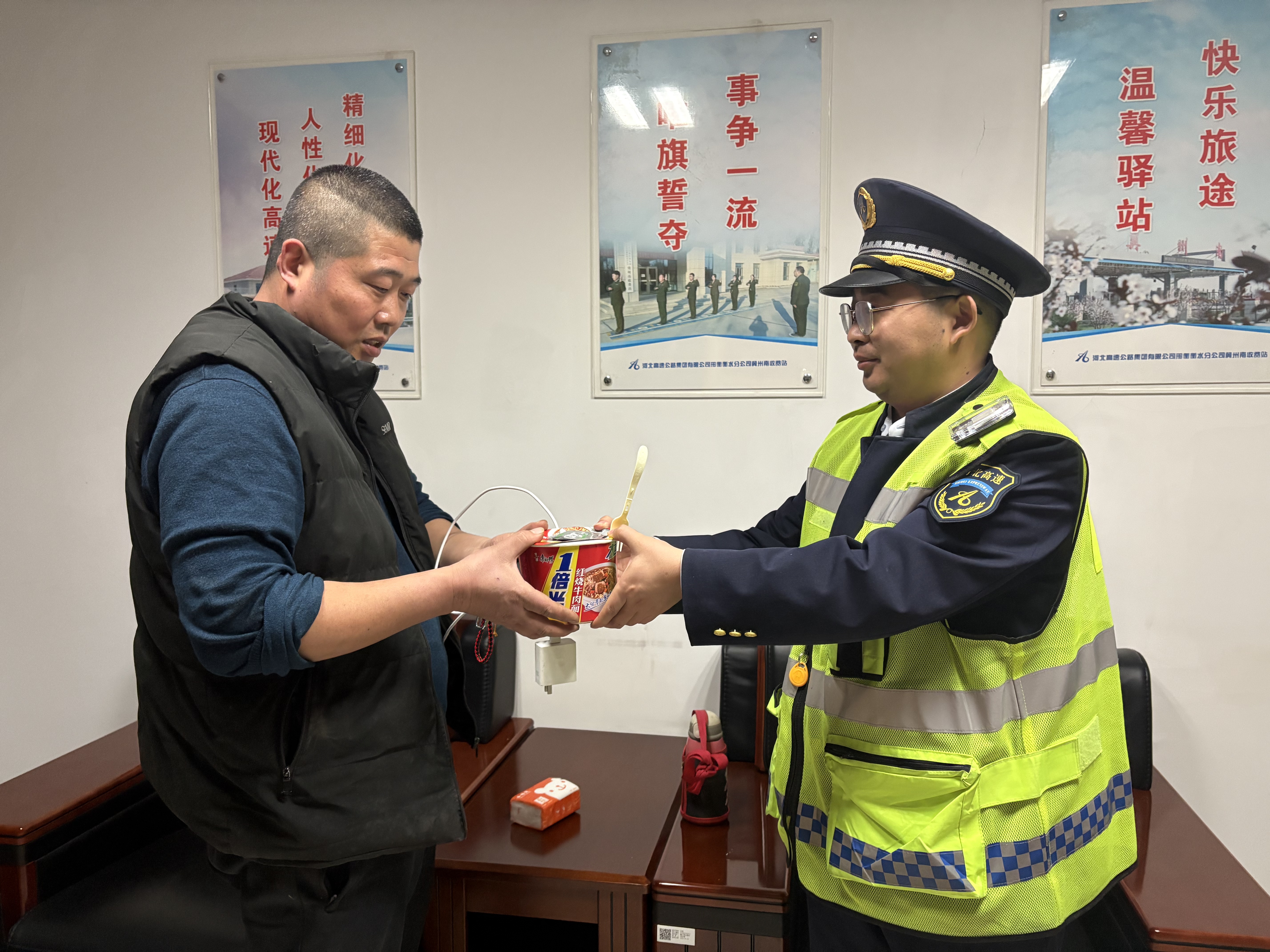 深夜故障车遇困 一碗泡面暖人心。2月21日22时许,李先生一家因车辆故障滞留在收费站外广场,在大风中等待救援一个多小时。当班班长发现后,立即端来热水泡面,引导车辆停靠安全区,并将一家老小请进休息室取暖。李先生感动地说:“孩子饿得直哭,没想到收费站送来了泡面,真是雪中送炭!”