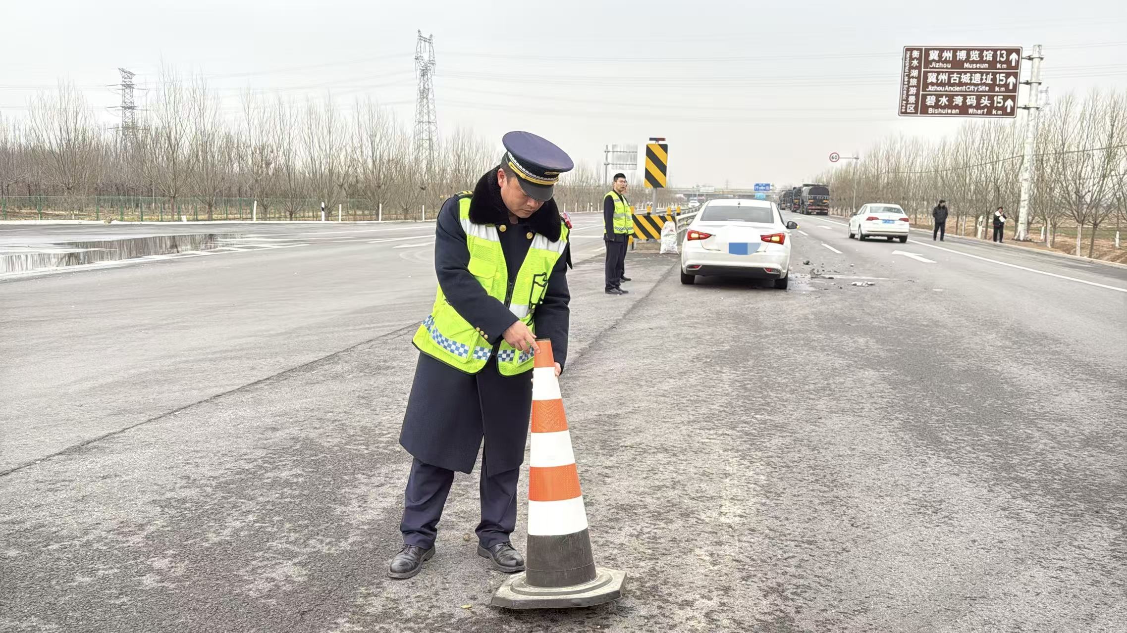 2月26日,一辆小型轿车驶出冀州西收费站后,在收费站出口与国道G339交叉口处,与东行六轴货车发生碰撞,事故导致车上人员受到惊吓,现场存在交通安全隐患。