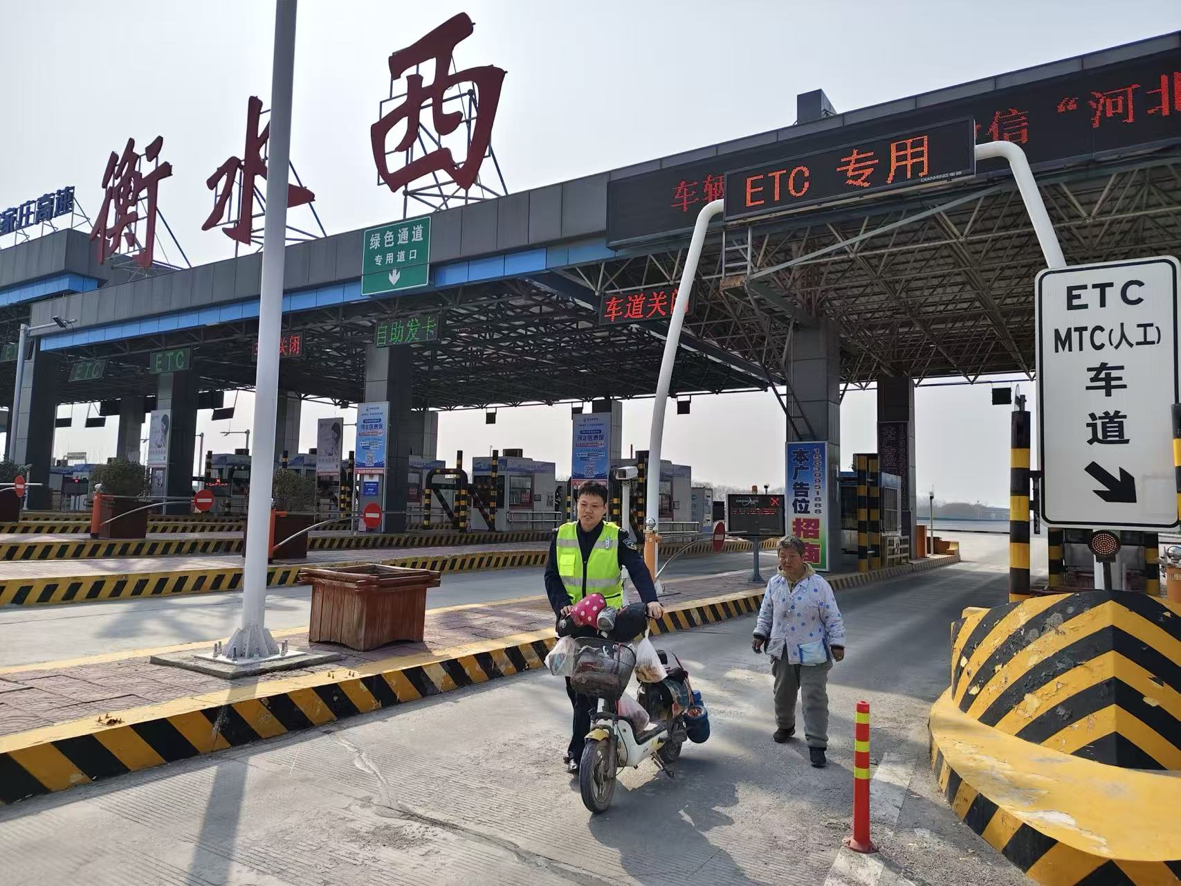 3月9日,一位年迈的老人骑着电动车误入衡水西收费站ETC车道,当班班长发现这一情况后,立即挥手示意老人停车。
