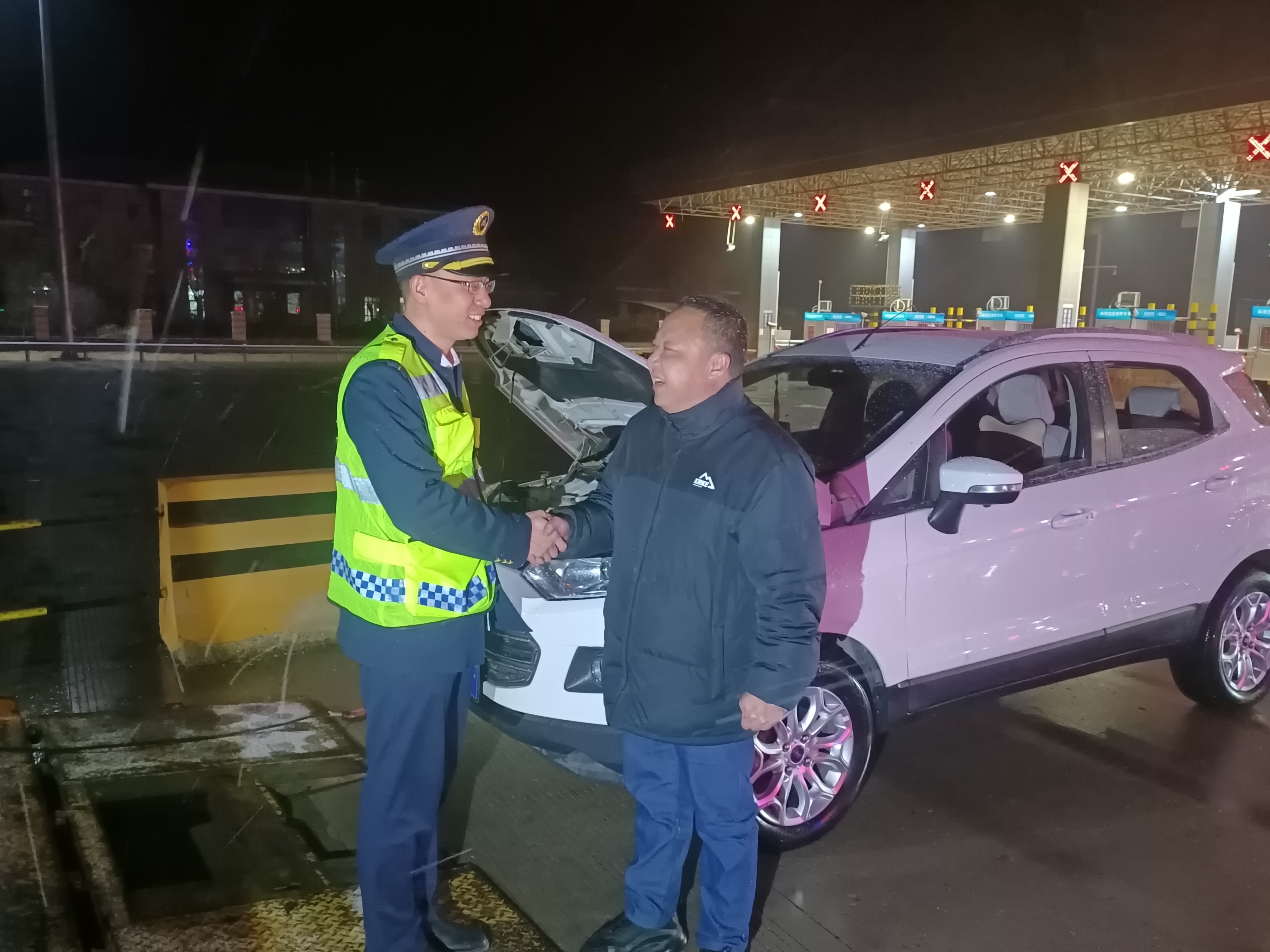 3月12日凌晨,一辆小型轿车驶入衡水西收费站出口外广场后,突然熄火,多次尝试启动均未成功,当班收费员发现情况后,第一时间上前询问,安抚司机焦急情绪,并立即将情况上报当班班长。