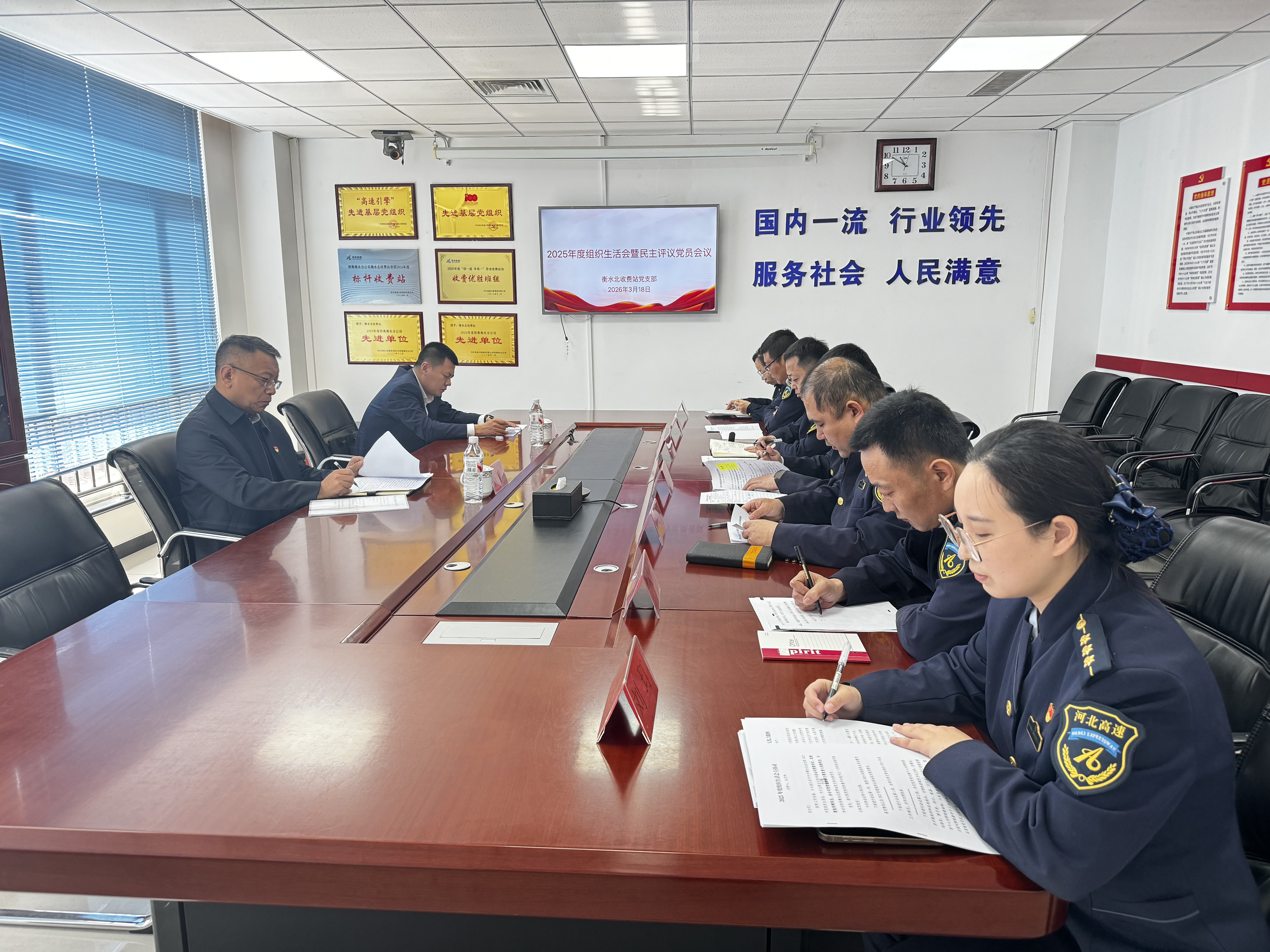 3月18日,衡水北收费站党支部召开2025年度组织生活会暨民主评议党员会议。分公司党委书记、总经理张同辉到会指导,会议由衡水北收费站党支部书记杜卫帅同志主持,支部全体党员参加会议。