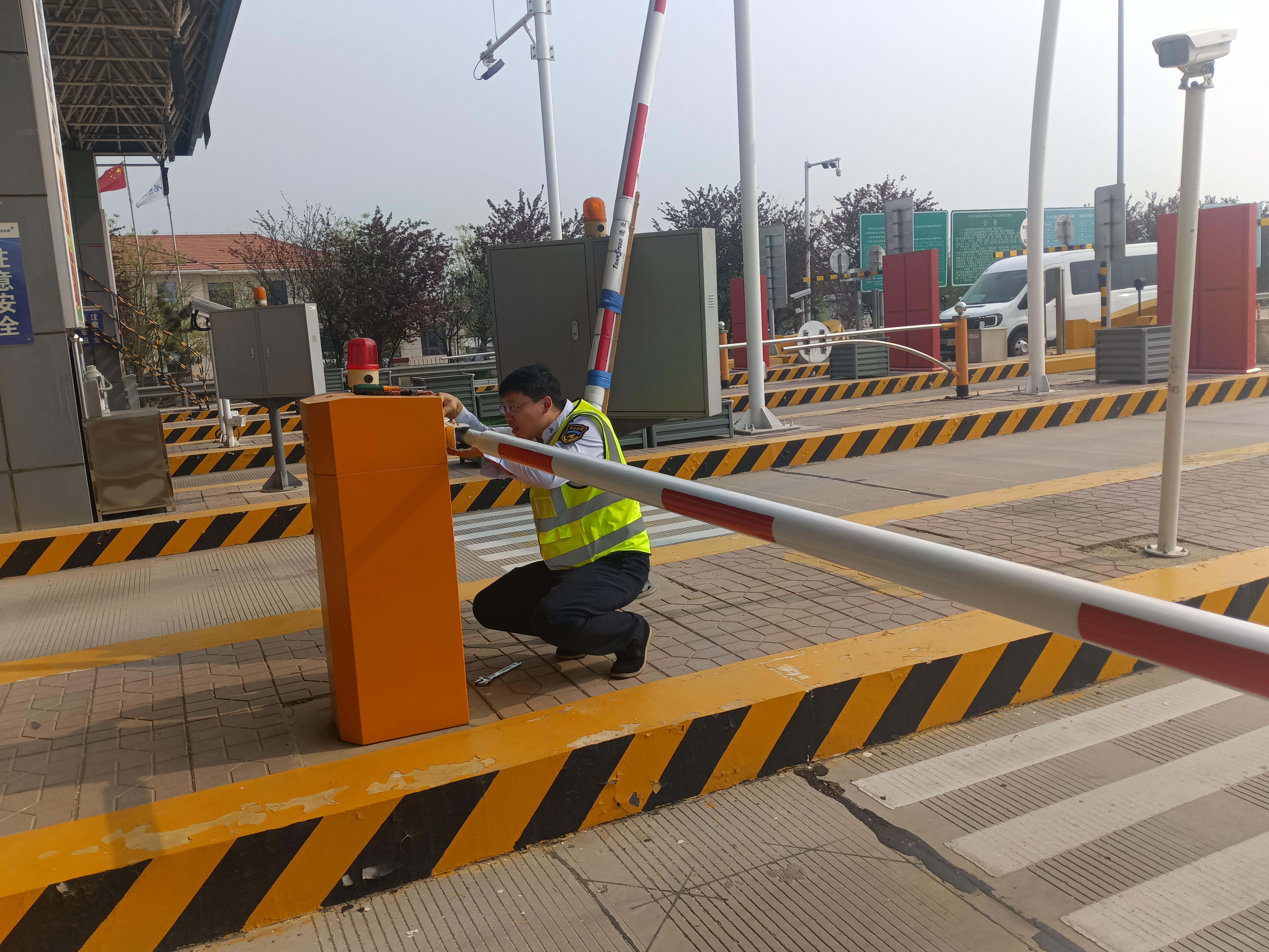 在收费区域巡查过程中,工作人员发现入口ETC车道自动栏杆被车辆撞坏,严重影响车道通行秩序,同时存在极大的安全隐患。为快速恢复车道正常运营,保障司乘出行安全,检查小组立即启动应急处置流程,第一时间对撞损栏杆进行拆除,同步完成新自动栏杆的更换、调试与试运行作业,全程严格遵循操作规范,确保新栏杆起落顺畅、闭合精准,彻底消除安全隐患,快速恢复车道正常通行。
