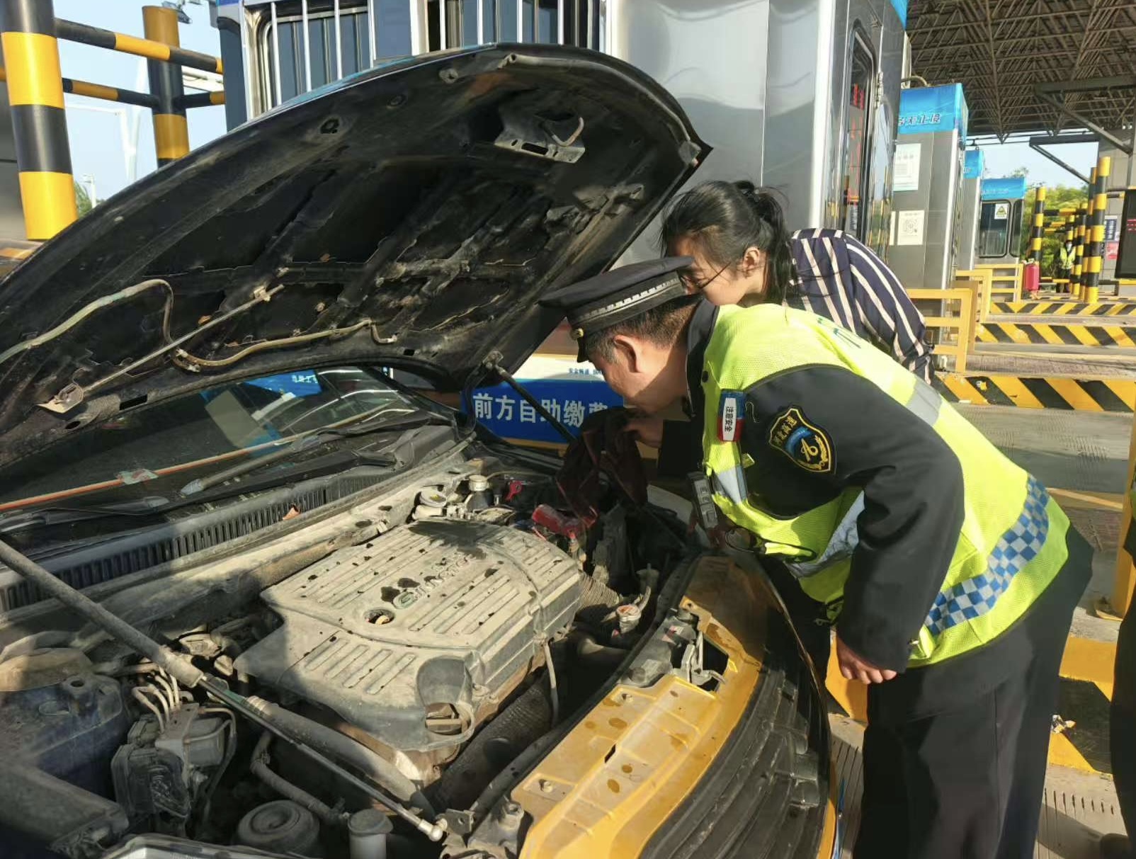 4月23日17时,衡水北收费站205车道一辆小客车行驶中突发险情,车头骤然冒出滚滚浓烟,随即蹿起明火,现场情况万分危急。